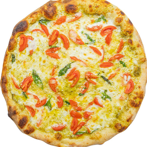 Pestosaus, mozzarella, grana padano, cherrytomaten, olijfolie en basilicum